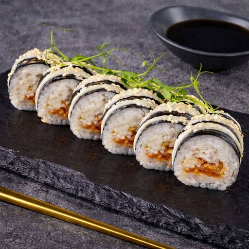 Рис, нори, сыр творожный, креветки тигровые, угорь, икра масаго, соус васаби сливочный, золото пищевое.