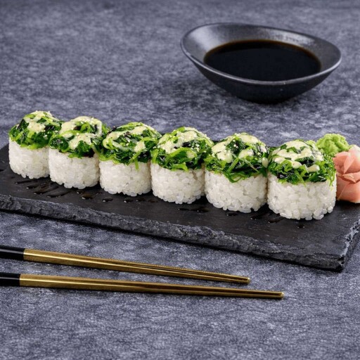 Рис, нори, сыр творожный, лосось, мусс из авокадо, икра лососевая имитированная, золото пищевое.