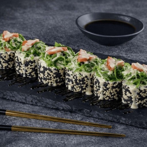 Рис, Нори, лосось, чука, икра Масаго , сыр творожный, ореховый соус, кунжут.