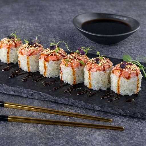 Рис, нори, обжаренный лосось, сыр, огурец, соус терияки, соус лава, соус унаги, кунжут.