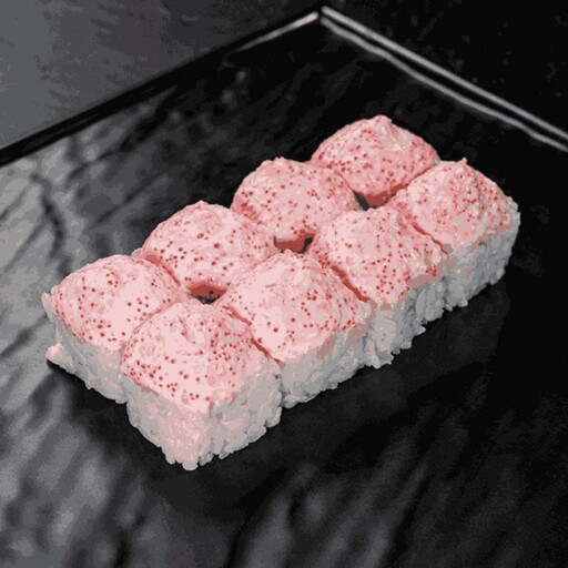 Рис, нори, лосось, огурец, творожный сыр, под шапкой из чуки и икры Масаго.